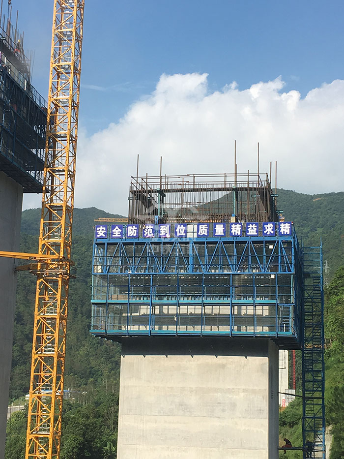項目簡介:大石田特大橋是開平至陽春高速公路上的一座重點(diǎn)大橋,跨越山溝,最大橋高為109.7米,主墩采用智能控制液壓同步頂升模架系統(tǒng)施工,每節(jié)段澆筑高度為2-3m。