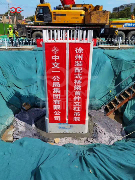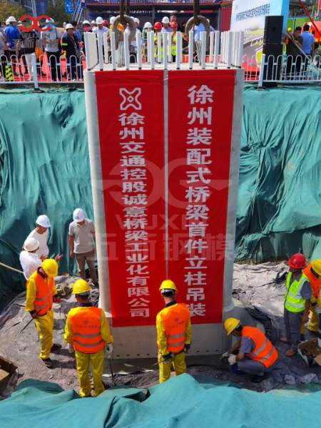 徐州交控誠意橋梁公司生產(chǎn)的第一個預(yù)制墩身成功對接中交一公局海威公司施工的徐州解放北路第一個承臺,無縫對接。