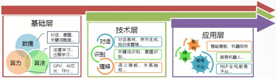 AI+NLP,具備認(rèn)知能力方能更懂用戶所言所想,層J劃分如圖18所示。國內(nèi)總體呈現(xiàn)出重應(yīng)用/輕創(chuàng)新的問題,AI+NLP“基礎(chǔ)建設(shè)”設(shè)施不全。優(yōu)劣勢明顯。優(yōu)勢有:1)技術(shù)鏈齊備:在基礎(chǔ)層/技術(shù)層/應(yīng)用層上均有所布局;2)中文NLP技術(shù):技術(shù)多面,對話系統(tǒng)、關(guān)鍵詞識別、語義理解效果提升明顯;3)數(shù)據(jù)資源豐富:收益于龐大的用戶群,可通過社交媒體收集相關(guān)文本、對話、翻譯數(shù)據(jù)。劣勢有:1)AI基礎(chǔ)層技術(shù)儲備不足;2)G度依賴國外計算硬件,GPU、AI芯片等;3)模型算法自主研發(fā)能力欠缺,G度依賴國外開源技術(shù);4)數(shù)據(jù)標(biāo)注和技術(shù)評價缺少統(tǒng)一的標(biāo)準(zhǔn)和規(guī)范。