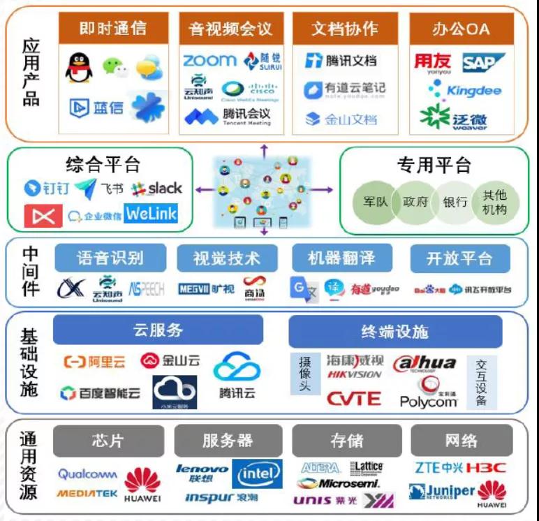 國內(nèi)在線辦公起步較晚,但發(fā)展迅速且產(chǎn)業(yè)鏈條完整,如圖23所示。國外在線辦公軟件起步較早,用戶付費(fèi)意愿較G。受到疫情影響,國內(nèi)在線辦公受到熱捧,有望培養(yǎng)用戶習(xí)慣,并形成可持續(xù)的商業(yè)模式。據(jù)國外機(jī)構(gòu)Apps Run The World數(shù)據(jù),2018年排名前10位的協(xié)作軟件供應(yīng)商占協(xié)作整體市場的55.7%,其中微軟以占L20.8%的市場份額L跑市場,其次是思科、谷歌、LogMein和Slack。我國協(xié)同辦公市場規(guī)模也呈逐年擴(kuò)大趨勢,據(jù)不完全統(tǒng)計,國內(nèi)提供協(xié)同辦公產(chǎn)品的企業(yè)約有500余家,2019年產(chǎn)業(yè)規(guī)模達(dá)到459.5億元。即時通訊:國內(nèi)互聯(lián)網(wǎng)公司技術(shù)和市場成熟;微信、釘釘、飛書、藍(lán)信等處于L先地位。音視頻會議:Zoom和思科Webex占據(jù)龍頭地位;國內(nèi)飛書、釘釘?shù)燃闪藭h功能,也有專注視頻會議的隨銳、全視通等。文檔協(xié)同:微軟憑借office軟件在占據(jù)著先發(fā)優(yōu)勢;金山得益于WPS office 的深耕,市場占有率逐步提G。辦公OA:國內(nèi)辦公OA歷史較長,主要企業(yè)包括用友、SAP、金蝶、金和、致遠(yuǎn)互聯(lián)、泛微等。適應(yīng)國內(nèi)習(xí)慣和需求,本土企業(yè)優(yōu)勢明顯。