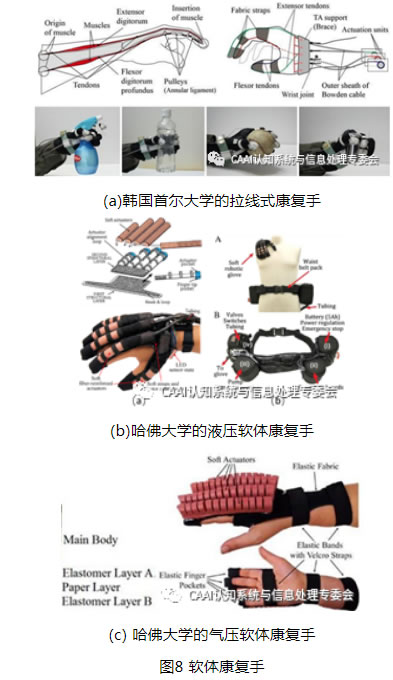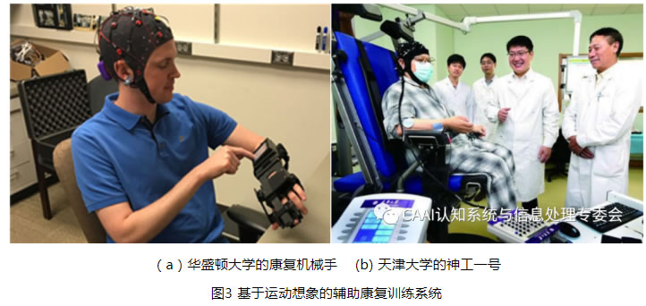美國凱斯西儲大學(xué)Daly等通過運動想象檢測大腦皮層神經(jīng)元的激活情況,表明BCI系統(tǒng)能有效地輔助患者誘發(fā)腦功能重塑并降低大腦皮層的異常激活。即主動的運動感知和被動外部設(shè)備相結(jié)合形成主被動康復(fù)訓(xùn)練系統(tǒng),將有利于受試者肢體的運動功能康復(fù)[4]。華盛頓大學(xué)Bundy等通過健側(cè)手部動作運動意圖輔助患者控制外骨骼機械手,實現(xiàn)了患者在日常生活中執(zhí)行康復(fù)訓(xùn)練[5],如圖3(a)所示。主被動康復(fù)訓(xùn)練系統(tǒng)不僅能輔助正常受試者康復(fù)訓(xùn)練,而且在患者的康復(fù)訓(xùn)練中也取得了一定的進展。德國圖賓根大學(xué)VárkutiB等通過運動想象控制MIT-MANUS機器人輔助患者上肢執(zhí)行康復(fù)訓(xùn)練,結(jié)果表明上肢運動功能得到明顯改善[6]。如圖3(b)所示天津大學(xué)明東教授團隊通過患者肘關(guān)節(jié)屈-伸運動想象控制“神工一號”康復(fù)機器人輔助肘關(guān)節(jié)的康復(fù)運動,增強了康復(fù)訓(xùn)練效果。西安交通大學(xué)徐光華教授團隊研究了目標(biāo)誘導(dǎo)的運動想象刺激范式,證明了有目標(biāo)導(dǎo)向的運動想象增強了對大腦皮層的激活并改善運動想象的能力[7]。韋恩州立大學(xué)Whyte等進一步提出了規(guī)范康復(fù)訓(xùn)練體系可幫助患者主動參與康復(fù)訓(xùn)練[8]。