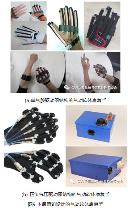 鑒于拉線式軟體康復(fù)手的驅(qū)動傳動系統(tǒng)較復(fù)雜、對手的壓迫感較強,液壓軟體康復(fù)手重量較大、有泄露污染的風(fēng)險,本課題組對重量更輕、成本更低、驅(qū)動控制較為簡單的氣動軟體康復(fù)手展開了研究。前期,本課題組利用限制層和纖維約束的單氣腔驅(qū)動器結(jié)構(gòu)設(shè)計,并基于電容變化原理利用介電彈性材料制作柔性傳感器,設(shè)計了如圖9(a)所示的集成柔性傳感器的氣動軟體康復(fù)手,改變限制層方向,可以輔助人手分別實現(xiàn)主動伸展和主動屈曲運動,并檢測手指彎曲角度進行康復(fù)效果評估[13]。但是該氣動軟體康復(fù)手無法輔助人手實現(xiàn)拇指的內(nèi)收/外展運動,也無法同時實現(xiàn)伸展/屈曲運動的雙向主動訓(xùn)練。為此,本課題組又利用波紋管制作的正負(fù)氣壓驅(qū)動器制作了如圖9(b)所示的氣動軟體康復(fù)手。該氣動軟體康復(fù)手僅有149克,采用開放式手套,通過欠驅(qū)動可以輔助手指實現(xiàn)伸展/屈曲運動和拇指的內(nèi)收/外展運動的主動訓(xùn)練;配套的便攜式氣動箱體積小、重量輕,G級康復(fù)版氣動箱可調(diào)節(jié)六個輸出氣路的壓力和流量;實驗表明,伸展/屈曲驅(qū)動器在伸展時的大作用力為4.6N,內(nèi)收/外展驅(qū)動器在內(nèi)收時大作用力為8.1N。當(dāng)前,該氣動軟體康復(fù)手的驅(qū)動器設(shè)計、控制設(shè)計仍在不斷地進行優(yōu)化。