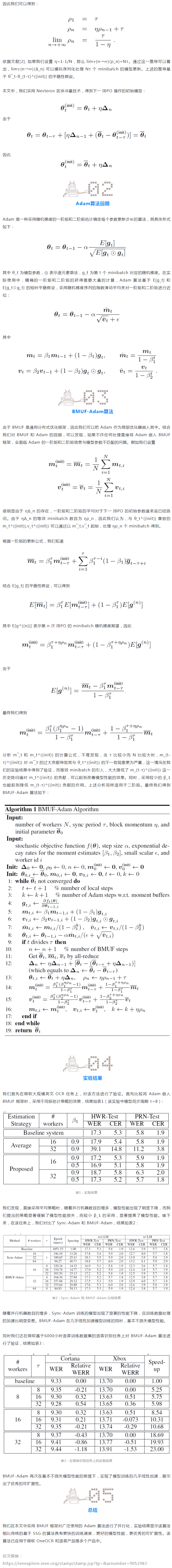 在基于 BMUF 的訓練框架下,假設我們總共有 N 個并行工作機,一個工作機可以是一塊或多塊 GPU 卡,也可以是一個計算節點。給定一個包含 Nτ 個 minibatch 的訓練數據子集,首先我們將這些數據均勻分布到 N 個并行工作機,每臺工作機獲得 τ 個 minibatch。從一個共同的初始模型 θ_(t-τ)^((init)) 開始,N 個工作機獨立更新各自的局部模型 τ 步,得到 {θ_(t,1),θ_(t,2),…,θ_(t,N)},對局部模型取平均得到 θ ̅_t。這一過程稱之為數據塊內并行優化(Intra-Block Parallel Optimization, IBPO)。與直接將 θ ̅_t 作為全局模型不同,BMUF 技術將歷史更新信息與當前更新信息結合,得到全局模型: