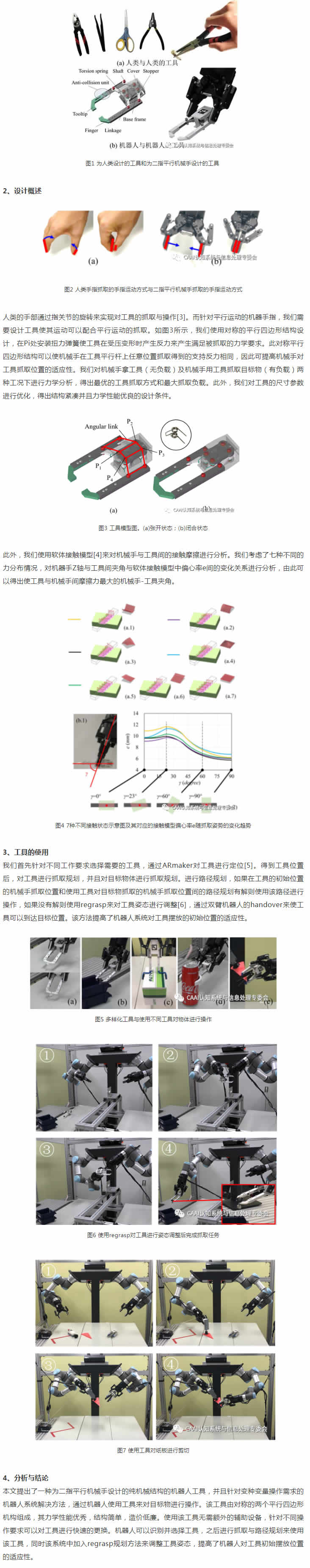現代自動化生產中要求機器人系統具備一定柔性以適應變種變量的生產需求。例如在機器人分揀及組裝中,機器人需要快速處理各式不同的物體。使機器人系統可以穩定并且低成本的操控多種目標物體是實現新一代G效自動化生產的重要研究目標。目前機器人系統針對多種物體的操作,主要通過機械手/手指更換設備或多功能機械手來實現[1][2]。然而機械手/手指更換設備需要部署輔助控制設備和外部能源供給,這增加了系統的復雜度。同時,設備的控制與供能需要引入電纜或氣管,這會對機械臂的自由靈活運動產生干擾。此外,多功能機械手僅可適用于一定范圍的操作任務。對此,我們提出了讓機器人使用不同工具來操作多樣化目標物的方法。這里提到的工具并不是機器人學中對終端執行器的稱呼,而是同人類使用的鑷子,剪刀等工具一樣的可以被機械手直接控制的工具。此工具為復雜的變種變量的操作任務提供了一項有效的解決方案,它有如下特征:(1) 通過機械機構實現機械手到工具的動力傳遞,無需外部控制及供能;(2)結構緊湊,對機器人的避障路徑規劃影響J小;(3) 通過設計不同的工具先端實現可以對多種任務進行有效配適,在更換工具時僅需要對目標工具進行一次抓取;(4)純機械機構設計,成本低廉,可靠性強。