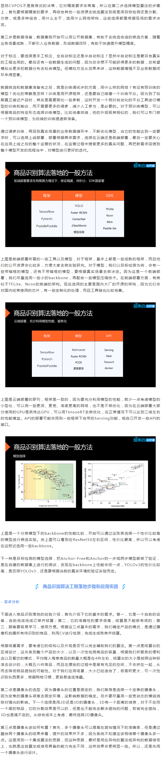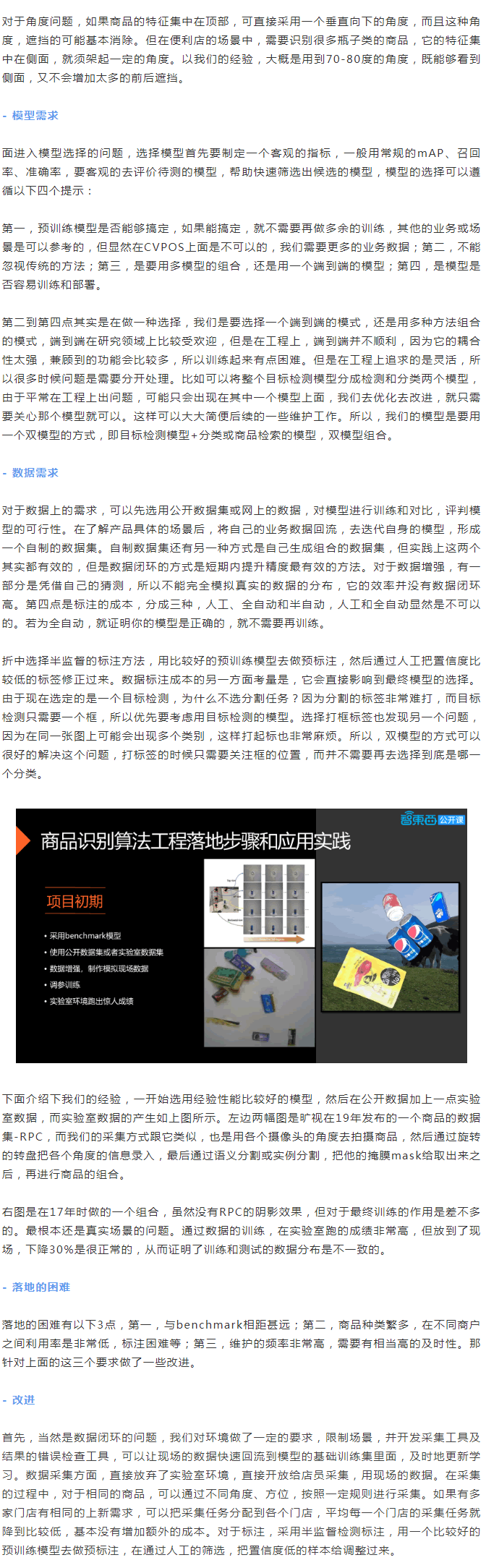 我們講到的自助收銀設(shè)備叫做CVPOS,從名稱看出它是借助視覺的技術(shù)的POS機。首先從它的基本的需求開始介紹,作為一個自助設(shè)備,它的基本功能是要自己操作,輸出訂單并完成結(jié)算,而不需要其他人員參與,這是產(chǎn)品D層的需求。再往下探一些需求,相比于掃碼支付而言,怎樣提升體驗?zāi)兀克梢砸淮巫R別多個,并且解決掃碼不能解決的非標(biāo)品問題。根據(jù)這兩級的需求,產(chǎn)品的模式是嘗試用攝像機拍攝結(jié)算臺上的所有的商品,用視覺模型進行識別。當(dāng)然也可以用別的傳感器,但是視覺是準(zhǔn)確的。如果大家了解這個行業(yè),可能會出現(xiàn)用重力傳感器去識別,但是它的限制會G很多。