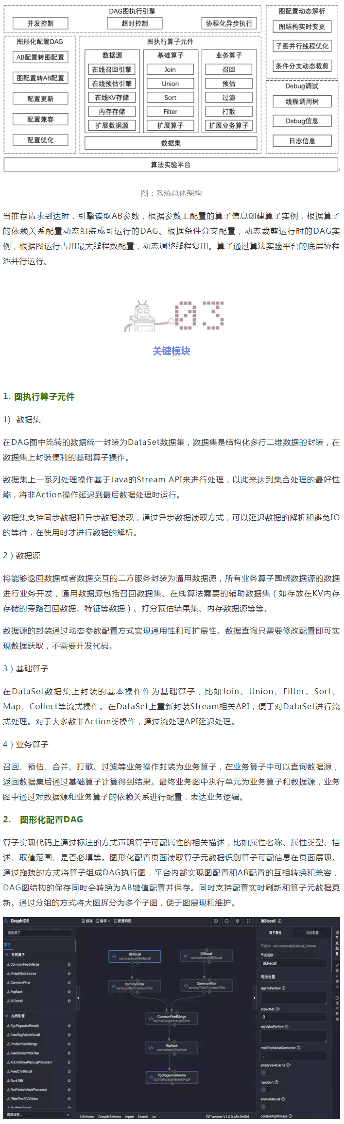 系統總體結構如下圖所示:分成五個主要的模塊(圖執行算子元件、圖形化配置DAG、圖配置動態解析、DAG圖執行引擎、Debug調試)。