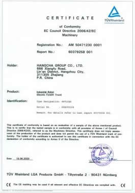 從技術層面看,工業叉車已從人工操控的機械產品向電子信息系統控制的智能產品轉變,對工業叉車的智能性和安全性提出了更G的要求。在認證機構萊茵的大力支持和指導下,杭叉集團協同三方技術力量,嚴格按照技術評審、關鍵零部件選型、樣機初檢、技術整改、現場試驗、資料整改要求,逐項攻克基礎性能、功能安全、電氣安全、風險評估中的技術難點,終獲得證書。