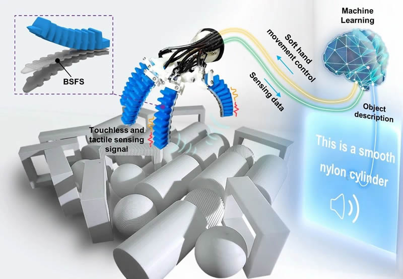 在人類感知世界的過程中,皮膚的多模態(tài)感知為我們感受真實(shí)的物理世界提供了重要的工具。正如人們用手指觸摸未知的物品,當(dāng)具有多模態(tài)感知能力的機(jī)器人手摩擦未知物品時(shí),機(jī)器人便能感知到物品的粗糙度;當(dāng)機(jī)器人手隔空拂過位置物品時(shí),它甚至能像X射線和3D掃描儀那樣感知到物品的材質(zhì)和形狀。因此,能夠感知環(huán)境的多模態(tài)傳感與擅長(zhǎng)交互的軟體機(jī)器人的結(jié)合必然能擦出火花。