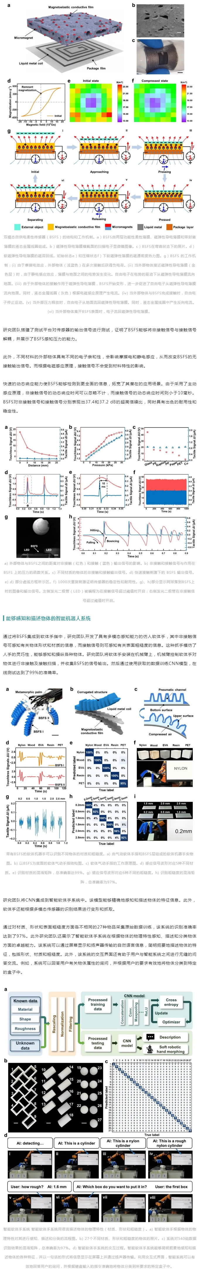 迄今為止,人們已經(jīng)為開發(fā)多模態(tài)柔性傳感器做出了許多努力,然而在分離和解耦各種刺激類型的信號(hào)方面仍存在挑戰(zhàn)。雖然研究人員一直致力于開發(fā)具有多模態(tài)柔性傳感器的智能機(jī)器人以感知各種環(huán)境信息,然而,目前的智能機(jī)器手缺乏多面的多模態(tài)信息感知,尤其是對(duì)表面物理特性的描述能力。這些局限性為軟體機(jī)器手進(jìn)一步感知多模態(tài)環(huán)境信息和執(zhí)行精細(xì)操作任務(wù)造成了阻礙。