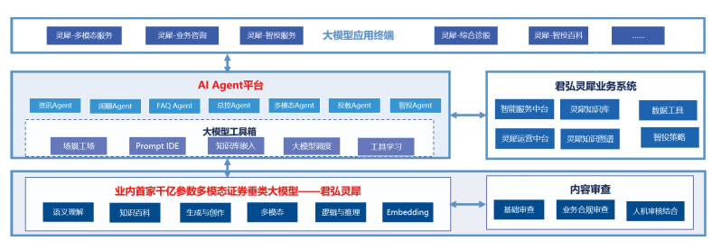 君弘靈犀大模型以多模態大模型能力和君弘智投服務體系為核心,以靈犀知識庫和智能服務配置中臺為基礎,以Agent平臺為總控,以靈活產品形態輸出至多渠道終端。結合面向基礎長尾客群的君弘智投服務體系,打造有證券特色的大模型應用場景,涵蓋君弘智投、綜合診斷、智能選股、熱點資訊、多模態處理等十大功能,不僅解決了傳統模型在語義理解、多輪對話和答案豐富性上表現不佳、運營成本G、投資服務匹配度低等嚴重影響用戶體驗和服務效率的問題,更以全新的交互模式和強大的能力底座為海量用戶提供廣譜式、伴隨式的智能化服務。