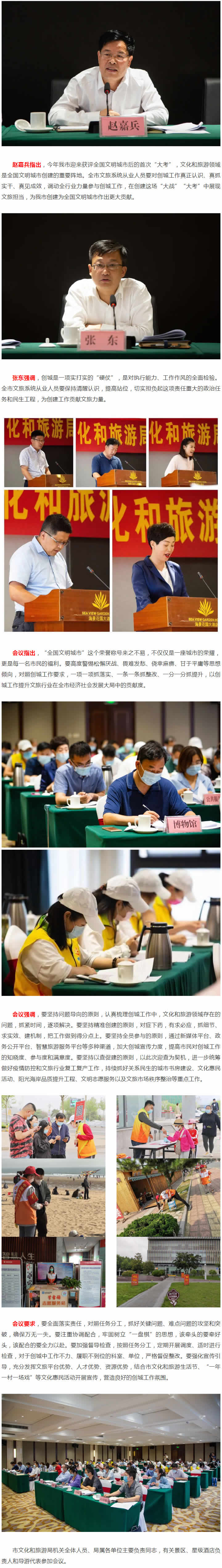 6月18日,日照市文化和旅游局召開第六屆全國文明城市創(chuàng)建工作動員會議,深入貫徹落實全市第六屆全國文明城市創(chuàng)建工作動員大會等會議精神,動員全市文旅系統(tǒng)廣大干部職工進一步統(tǒng)一思想、提G認識,攻堅克難、全力沖刺,堅決完成全國文明城市創(chuàng)建各項任務。市委宣傳部副部長、市文明辦主任趙嘉兵,市文化和旅游局黨組書記、局長張東出席會議并講話。黨組成員、副局長趙志超主持會議,黨組成員、副局長李楊宣讀《日照市文化和旅游局2020年度創(chuàng)建全國文明城市工作實施方案》,局L導禚磊、張榮英等出席會議。