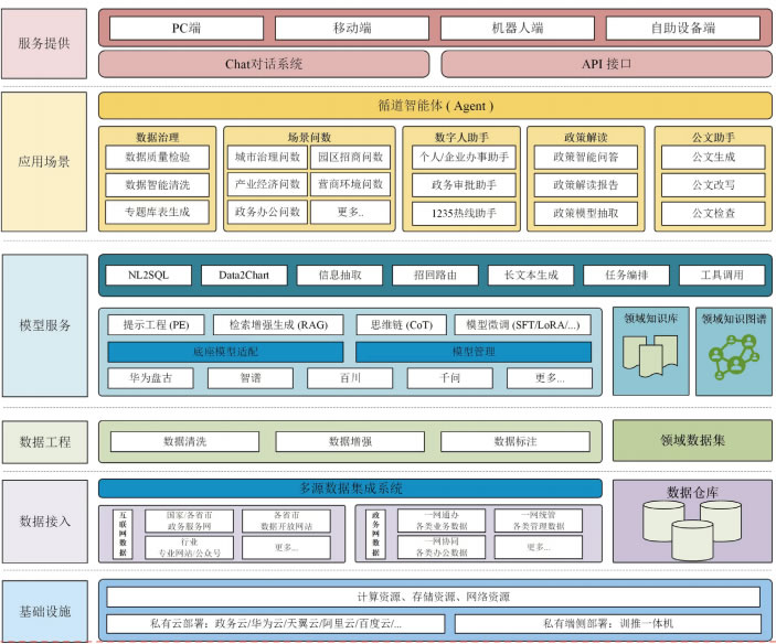 (2) 采用本地私有云資源部署的方式,定制化構建、調優從算力、模型架構到模型訓練語料全鏈路自主可控 的政務垂域大模型,賦能更多有意義的場景應用。