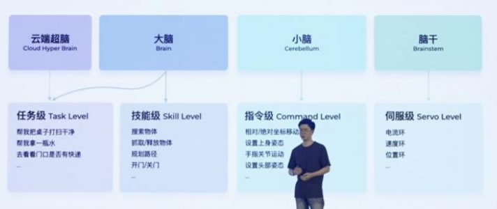 “小腦”負責產(chǎn)生運動控制指令生成,比如設置上身姿態(tài)、控制指關節(jié)運動、控制頭部姿勢等,涉及運動學、動力學;另外“腦干”這一層級主要是解決底層的運動控制能力問題,比如所有電
