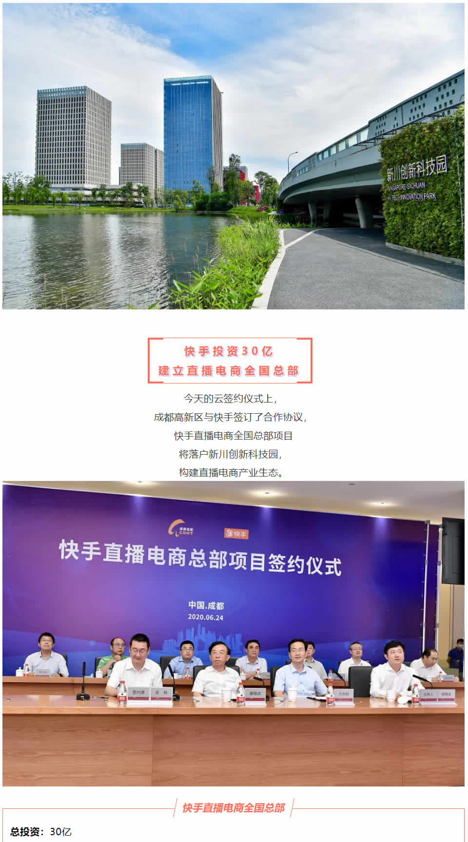 6月24日, 成都G新區分別與頭部短視頻平臺快手、中國互聯網BAT三巨頭之一的百度簽約,宣布快手直播電商全國總部項目和百度智能駕駛項目落戶新川創新科技園。
