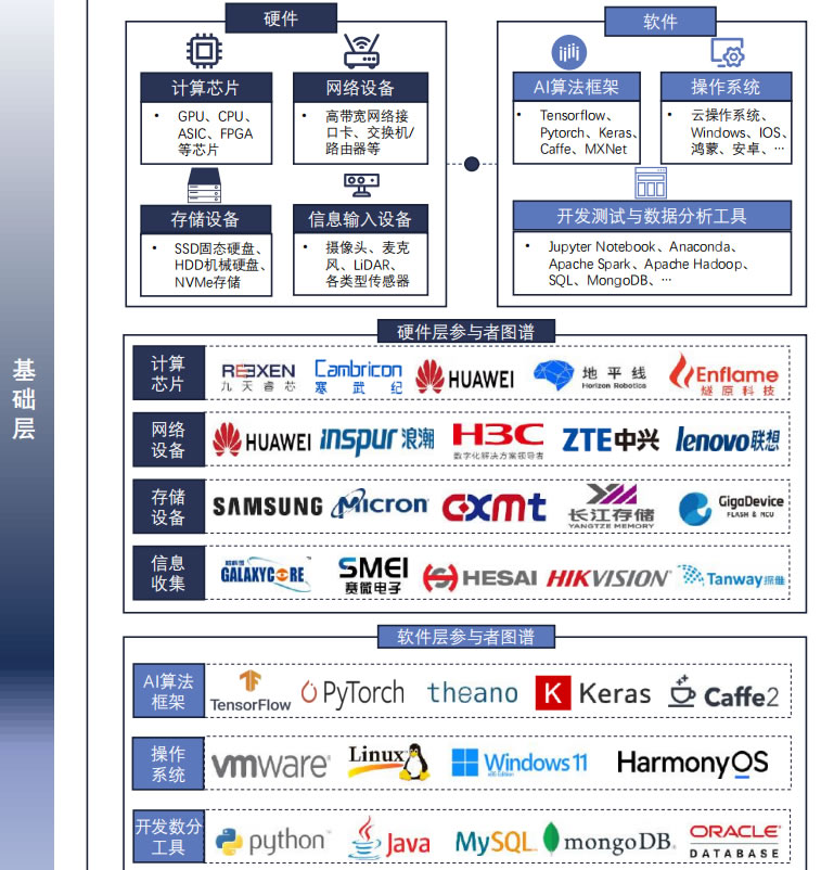人工智能基礎(chǔ)層涵蓋計(jì)算芯片、網(wǎng)絡(luò)設(shè)備、存儲(chǔ)設(shè)備和信息采集設(shè) 備,以及操作系統(tǒng)、開(kāi)發(fā)測(cè)試分析工具和AI算法框架,共同構(gòu)成了 人工智能產(chǎn)業(yè)發(fā)展的基石底座