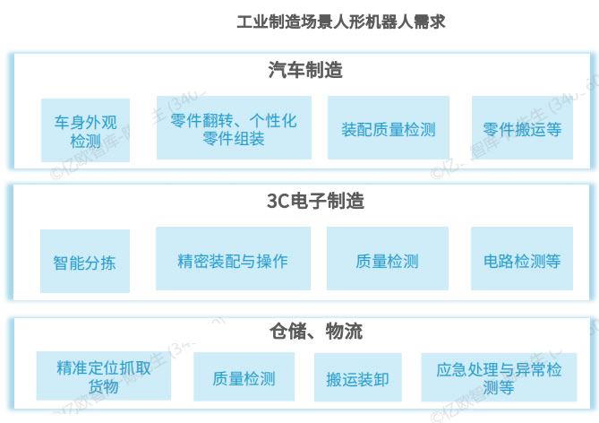 工業(yè)制造場(chǎng)景因其單—性和重復(fù)性特點(diǎn),是人形機(jī)器人應(yīng)用易實(shí)現(xiàn)落地的場(chǎng)景, 并終過(guò)渡至C端場(chǎng)景中。
