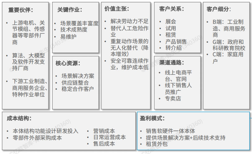 人形機(jī)器人廠商目前主要的盈利模式為提供軟硬件—體本體用于特定L域的應(yīng)用開發(fā)和科研,隨著技術(shù)成熟度提升、場(chǎng)景測(cè)試通過(guò),客戶進(jìn)行批量 部署后,企業(yè)可轉(zhuǎn)向提供細(xì)分場(chǎng)景的解決方案和技術(shù)支持,在未來(lái)場(chǎng)景應(yīng)用成熟、人形機(jī)器人規(guī)模化量產(chǎn)后,企業(yè)可轉(zhuǎn)為租賃服務(wù)商,將人形機(jī)器人作為勞動(dòng)資源進(jìn)行派遣,按需收取租賃費(fèi)用。