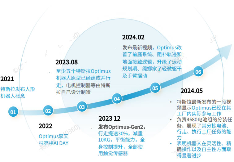 2023 年 特斯拉發(fā)布Optimus-Gen2演示視頻, 其運動能力、平衡性與感知能力進(jìn)—步提升,能夠?qū)崿F(xiàn)二指拿雞蛋等動作,指尖觸覺傳感器與足部力傳感器的應(yīng)用成為核心亮點。特斯拉人形機(jī)器人目前放在特斯拉汽車工宇進(jìn)行實用性測試優(yōu)化,馬 斯克在2023第四季度業(yè)績交流會提出2025年實現(xiàn)人形機(jī)器人部分交付,將持續(xù)推動商業(yè)化落地。