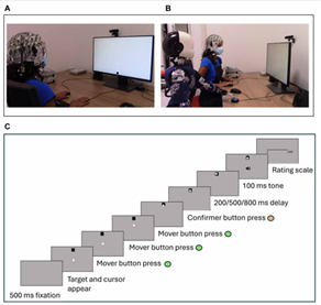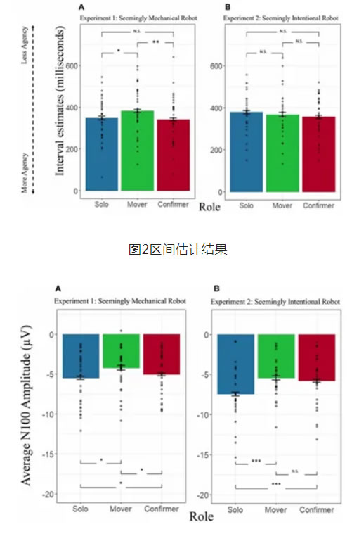 在這項(xiàng)研究中,科學(xué)家們使用了時(shí)間間隔估計(jì)任務(wù)(如圖2)和腦電圖(EEG)(如圖3)來(lái)評(píng)估人們?cè)谂c機(jī)器人合作時(shí)是否能感受到共同代理感(Sense of Joint Agency, SoJA),以及這種感覺(jué)是否受到人們對(duì)機(jī)器人意圖歸因的影響。