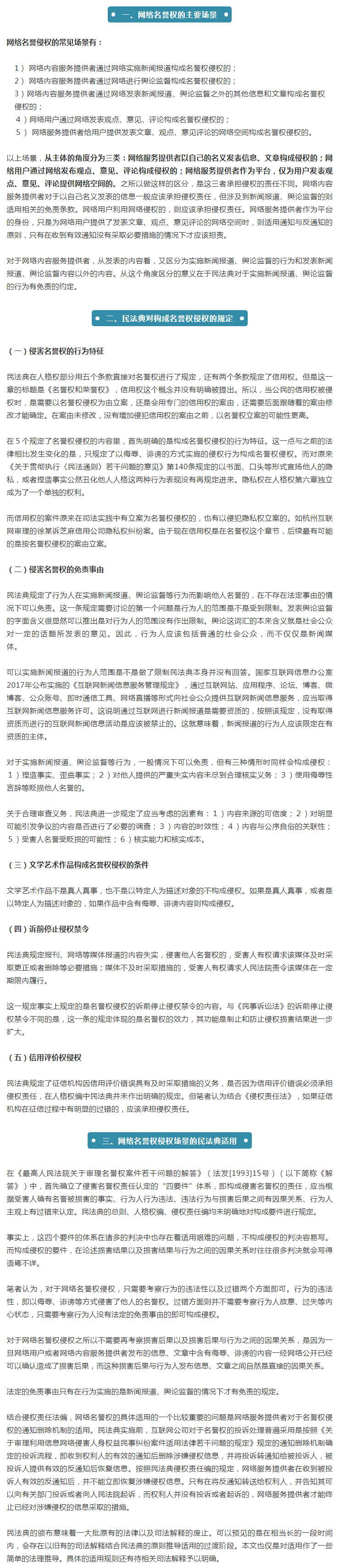 《中華人民共和國(guó)民法典》經(jīng)十三屆全國(guó)人大三次會(huì)議審議通過(guò),這是新中國(guó)D一部以“法典”命名的大法。民法典的亮點(diǎn)之一是人格權(quán)的獨(dú)立成編,亮點(diǎn)二是諸多的互聯(lián)網(wǎng)條款的規(guī)定,使得這部法典呈現(xiàn)了鮮明的互聯(lián)網(wǎng)時(shí)代的印記。作為這兩個(gè)亮點(diǎn)疊加下的網(wǎng)絡(luò)名譽(yù)侵權(quán)也是民法典頒布后倍受關(guān)注的條款。
