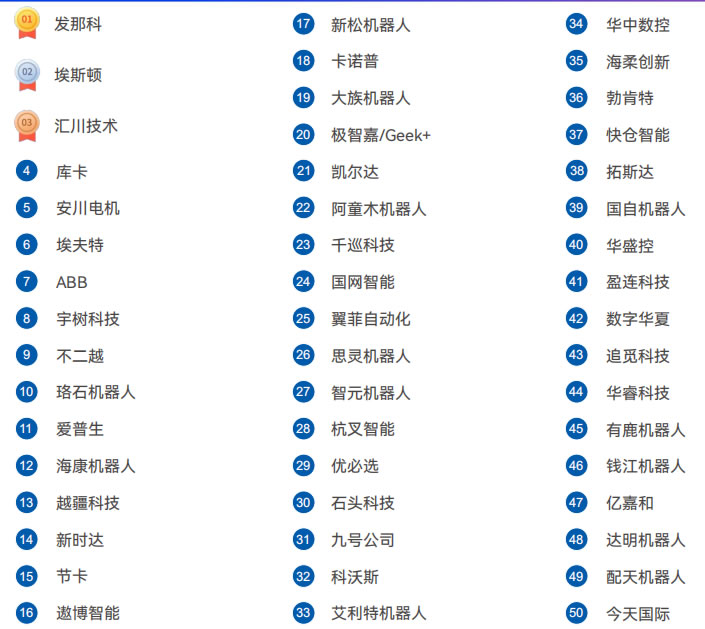 匯川技術(shù),珞石機(jī)器人,越疆科技,節(jié)卡,埃斯頓,遨博智能,埃夫特,海康機(jī)器人,新時達(dá),大族機(jī)器人,阿童木機(jī)器人,新松機(jī)器人,極智嘉/Geek+