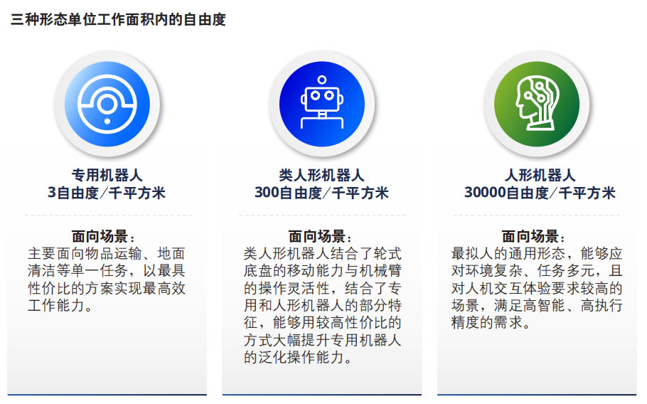 基于 “單位工作面積自由度”這一指標(biāo),可以更好地理解專用、類人形、人形三種形態(tài)機(jī)器人各自 的優(yōu)勢和適用場景,以及如何根據(jù)特定的應(yīng)用需求選擇合適的機(jī)器人形態(tài),從而進(jìn)一步推動(dòng)生態(tài)的 構(gòu)建: