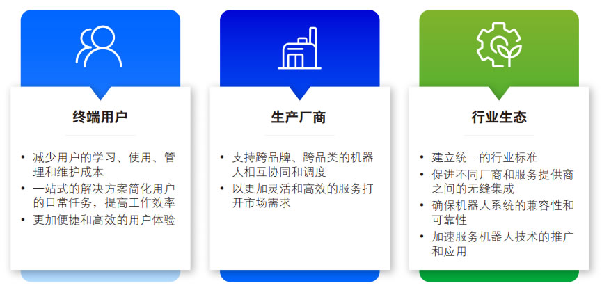 對于廠商來說,開放性的全棧式智能服務(wù)機(jī)器人生態(tài)提供了機(jī)器人之間的相互協(xié)同和調(diào)度的能力。這種協(xié)同能力使得不同廠商的、不同類 型的機(jī)器人可以在同一個環(huán)境中協(xié)同工作,完 成更復(fù)雜的任務(wù)。開放性的全棧式智能服務(wù)機(jī) 器人生態(tài)提供了一個平臺,多類型機(jī)器人可自 主優(yōu)化作業(yè)路徑、規(guī)避沖突并形成任務(wù)閉環(huán), 顯著提升復(fù)雜場景下的整體服務(wù)效率。使得機(jī) 器人能夠作為一個整體系統(tǒng)協(xié)同工作,提供更 加靈活和高效的服務(wù)。對廠商而言,這種生態(tài) 化協(xié)作將推動行業(yè)從單一產(chǎn)品競爭轉(zhuǎn)向多品類 產(chǎn)品矩陣的生態(tài)建設(shè)。
