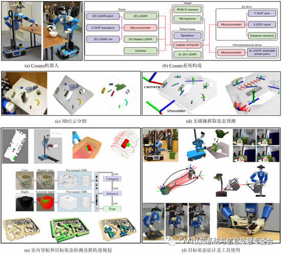 Cosero[1]是德國波恩大學(xué)的Sven Behnke團隊根據(jù)家庭環(huán)境中的日常操作任務(wù)而研制的一款仿人操作機器人(如圖1(a)(b))。機器人底部配備了四輪獨立轉(zhuǎn)向行走機構(gòu),以便在靈活的通過狹窄通道,上部配備了兩個7自由度機械臂已完成擬人的操作,并在夾持器末端裝有紅外測距傳感器已達到對抓取目標的距離探測,在D端安裝有Kinect相機,以實現(xiàn)對目標環(huán)境的3D感知。Cosero通過底盤的激光雷達進行導(dǎo)航和定位,采用法線估計和場景分割相結(jié)合的方法對目標進行3D點云分割,采用無碰撞抓取方法[1]對目標物體進行抓取(如圖1(c)(d))。在論文[2]中,作者運用Cosero進行零件分揀搬運實驗,通過2D激光雷達導(dǎo)航到作業(yè)點,通過RGB-D相機對目標進行識別分割,規(guī)劃抓取路徑和抓取姿態(tài)估計(如圖1(e))。在論文[3]中,作者采用深度學(xué)習(xí)方法對目標進行姿態(tài)估計,并完成了提壺灌溉,人機交互和使用工具等復(fù)雜任務(wù)(如圖1(f))。Schwarz[4]介紹了Cosero基于深度學(xué)習(xí)方法的目標姿態(tài)估計和RGB-D SLAM等感知測量。