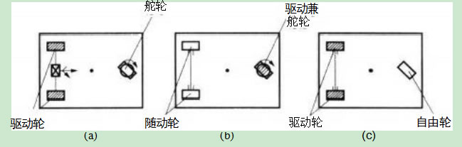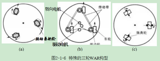 輪配置中也有一些很少見的配置方式,如圖2-1-6所示,圖2-1-6(a) 中 三 個(gè) 輪互成120°。車輪不僅可d立驅(qū)動(dòng)而且可以d立轉(zhuǎn)向;圖2-1-6(b) 三個(gè)車輪采用 同步驅(qū)動(dòng)系統(tǒng)控制,三個(gè)車輪同時(shí)用來驅(qū)動(dòng)與轉(zhuǎn)向,這種機(jī)器人一個(gè)突出的特點(diǎn)是機(jī)器人本體相對于地面的姿態(tài)保持不變;圖2-1-6(c) 互成120°布置的三個(gè)車輪采用瑞典輪,通過d立驅(qū)動(dòng)各輪可實(shí)現(xiàn)機(jī)器人全方位移動(dòng)。