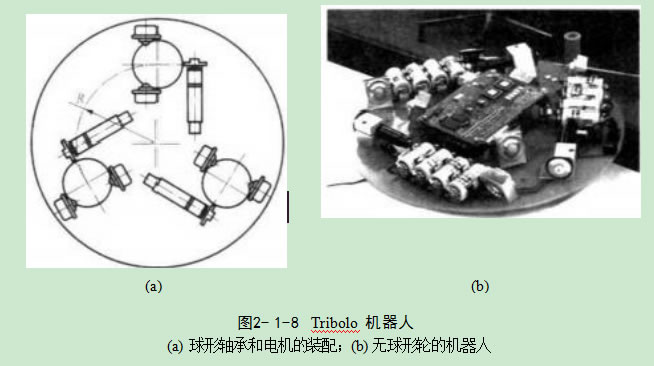 其次,移動(dòng)機(jī)器人底盤的移動(dòng)方向無直接控制,輪子不對稱的情況會(huì)產(chǎn)生各種類型 的誤差。 瑞士聯(lián)邦理工大學(xué)設(shè)計(jì)的 Tribolo 是采用3個(gè)球形輪的全向驅(qū)動(dòng)的實(shí)例,如圖2-1-8(a) 所示,3個(gè)球形輪各由一個(gè)電機(jī)激勵(lì),3個(gè)接觸點(diǎn)將球形輪懸掛起來, 其中2個(gè)點(diǎn)由球形軸承給定,另一個(gè)由連接到電機(jī)軸的輪子給定。這種設(shè)計(jì)的機(jī) 器人機(jī)動(dòng)性比較好,而且設(shè)計(jì)簡單,但是它只適用于平坦的路面和小路,要制造摩擦系數(shù)大的圓形輪子是十分困難的。