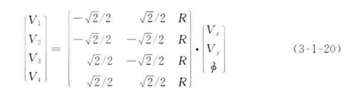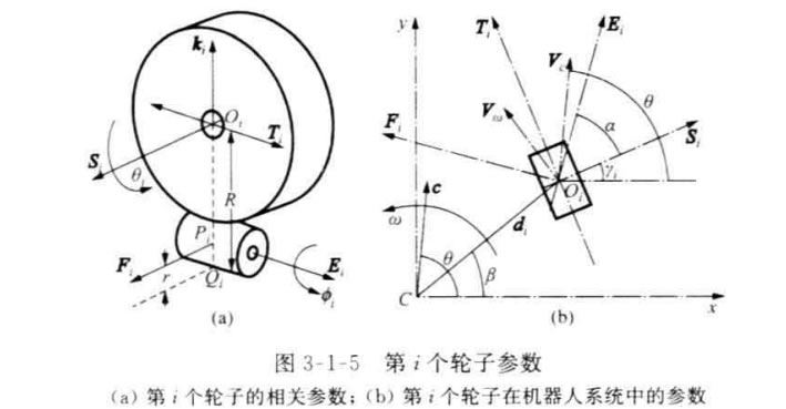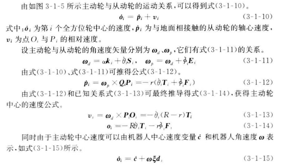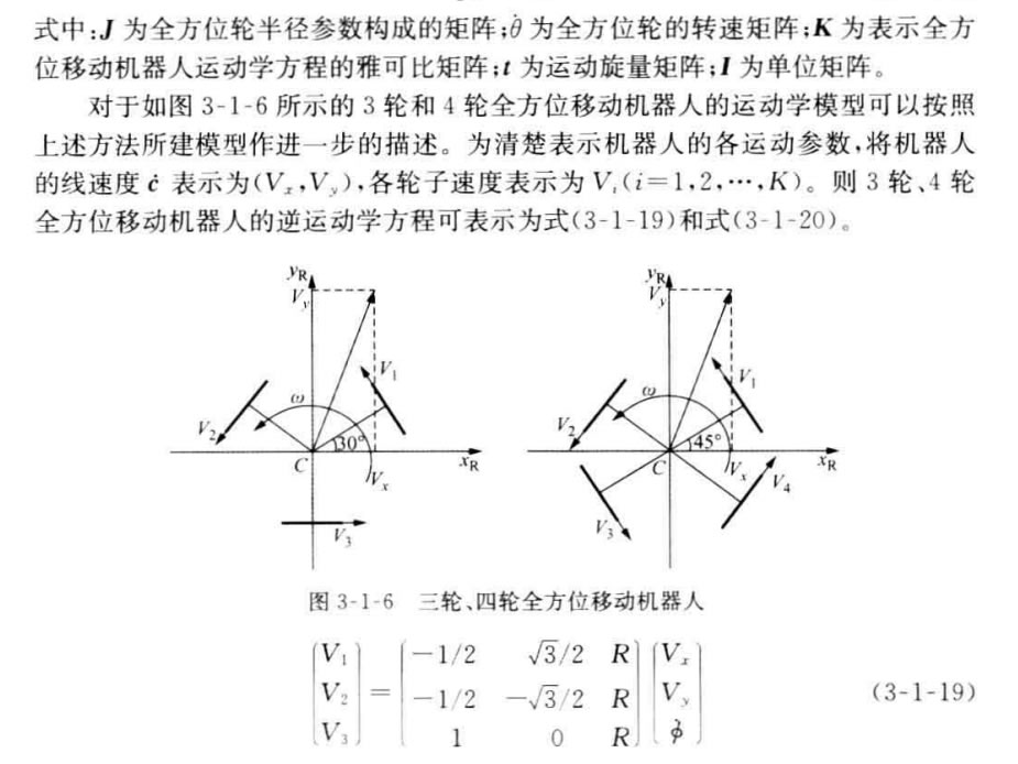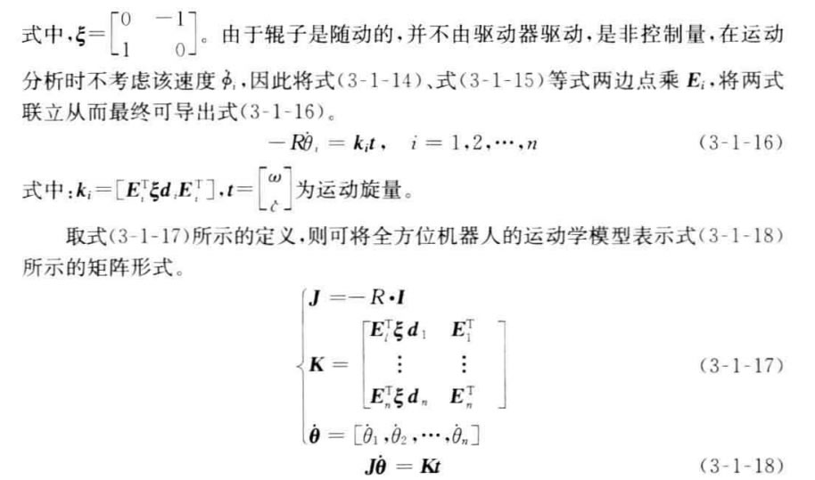 具有傳統車輪的機器人只能有兩個自由度的運動,所以在運動學上,它等價于 傳統的陸上車輛。然而,具有全方位輪的機器人有3個自由度運動的能力,即沿著 平面上x 軸、y 軸以及繞自身中心旋轉的運動能力,這充分增加了機器人的機動 性。本節將給出這種全方位移動機器人的運動學模型。
