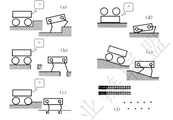 腿式運動以一系列機器人和地面之間的點接觸為特征。其主要優點包括在粗糙地形上(圖2.5)的自適應性和機動性。因為只需要一組點接觸,所以只要機器人能夠 保持適當的地面整潔度,這些點之間的地面質量是無關緊要的。另外,只要行走機器 人的步距大于洞穴的寬度,它就能跨越洞穴或者裂口。腿式運動的Z后一個優點是, 能用高度的技巧來操縱環境中的物體。舉一個精彩的昆蟲例子,即甲殼蟲,它用靈巧 的前肢在運動的同時能夠滾動一個球。