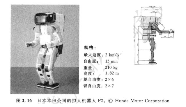 本田公司的擬人機(jī)器人項(xiàng)目有著值得注意的發(fā)展經(jīng)歷。但是此外,它還抓住了 激勵的非常重要的工程挑戰(zhàn)。圖2.16展示了模型 P2, 它是Z新模型 Asimo (在發(fā)明 移動性中有超前步伐)Z直接的先驅(qū)。注意,Z新的本田 Asimo 模型仍然比 SDR- 4X I大得多,高120 cm, 重52 kg 。這可在保持不危險尺寸和姿勢的同時,能在有樓 梯和臺階的人類環(huán)境中具有實(shí)用的機(jī)動性。也許這是展示仿生的雙腳上下樓梯的第 一個機(jī)器人。這些本田擬人系列的機(jī)器人不是專門為娛樂目的而設(shè)計(jì),而是作為整 個社會的人類幫手而設(shè)計(jì)。例如,本田公司把Asimo 的高度當(dāng)作機(jī)器人能對人類環(huán) 境進(jìn)行管理操作(如控制燈開關(guān))的Z小高度。