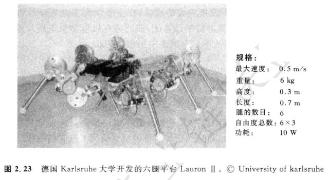 由于行走期間的靜態(tài)穩(wěn)定性,六腿結(jié)構(gòu)在移動機(jī)器人學(xué)中已經(jīng)很流行(圖2.23 和圖1.3),因而降低了控制的復(fù)雜性。在大多數(shù)情況下,各條腿有3個自由度,包括