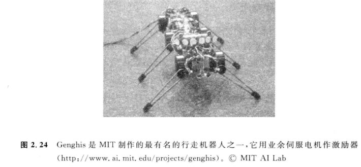 臀部彎曲、膝蓋彎曲和臀部外展(圖2.7)。Genghis 是一個商業(yè)上已可用的有6條腿 的業(yè)余機(jī)器人,各腿有業(yè)余伺服電機(jī)所提供的2個自由度(圖2.24)。這樣的機(jī)器人 僅由臀部彎曲和臀部外展組成,在粗糙的地形中機(jī)動性較差,但在平地上則表現(xiàn)很 好。因?yàn)樗怯芍蓖群退欧姍C(jī)簡捷裝配而成,所以機(jī)器人業(yè)余愛好者可以很容易 地制作這種機(jī)器人。