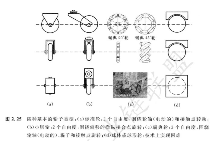 當我們考慮移動機器人運動的可能技術時,可能的輪子結構有 很大的空間。因為有很多數目不同的輪子類型,各有其特定的優點和缺點,故我們從 詳細討論輪子開始,然后來檢驗為移動機器人傳送特定運動形式的完整的輪子構造。