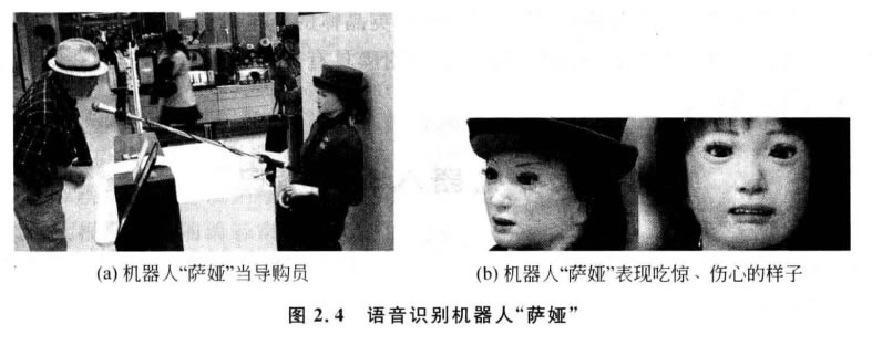 日本著名的東京高島屋商場為了解決顧客排長隊(duì)購物難的問題,引入了一款語音識(shí) 別機(jī)器人“薩婭”當(dāng)導(dǎo)購員,如圖2.4所示。“薩婭”能夠用超過700種不同的語音方式對(duì) 購物者的問題和投訴做出反應(yīng),它會(huì)告訴顧客去哪層樓能夠買到他們所需的商品,還能 和他們閑聊幾句,但是有時(shí)也會(huì)無法“溝通”。曾有一位記者問“薩婭”問題,可能是因?yàn)? 他口音太重,“薩婭”聽不懂,一直指著洗手間的方向,無法告訴記者所要去的商場樓層。 雖然“薩婭”的面部動(dòng)作還存在一些不足,但是它表現(xiàn)高興、傷心或生氣時(shí)是很逼真的。 盡管“薩婭”是一個(gè)語音識(shí)別服務(wù)機(jī)器人,但是它像其他日本人那樣講禮貌,彬彬有禮。