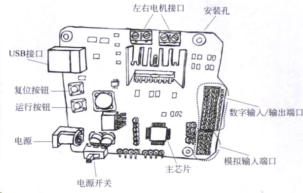 機器人套件里形形色色的傳感器和執行器是如何連接到主控制器上的呢?大家拿出主控器,可以看到它的上面有很多金屬插針,對應于圖4-1中數字輸入/輸出端口、模擬輸 入端口的位置,這些插針是我們連接所有傳感器、執行器的插口。