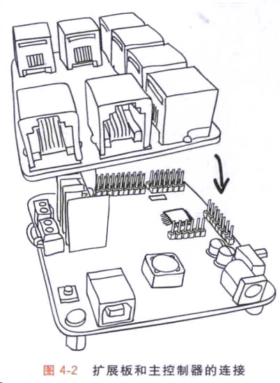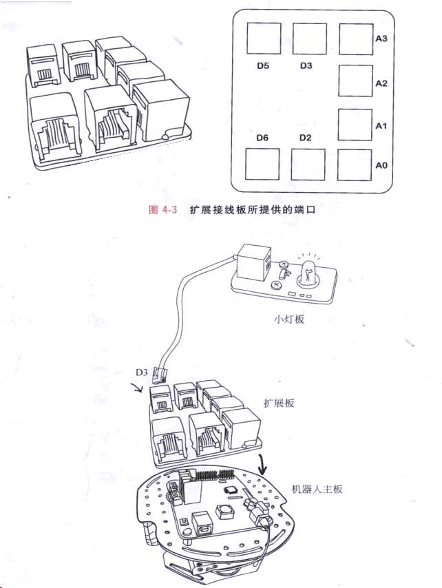 圖4 - 2是我們為機器人配備的 擴展接線板。將它和主控制器插到 一起后,就 能很方便地用灰色的RJ11 線連接各種傳感器 和執行器,而不用擔心線路連錯或連反。 這種簡單的方法不是沒有代價的,因為擴 展板占用的空間更大,所以提供的接口就少了 很多