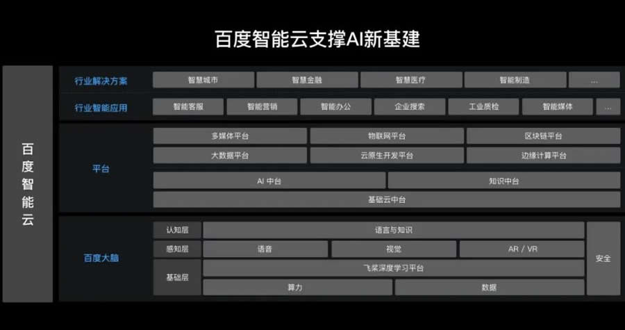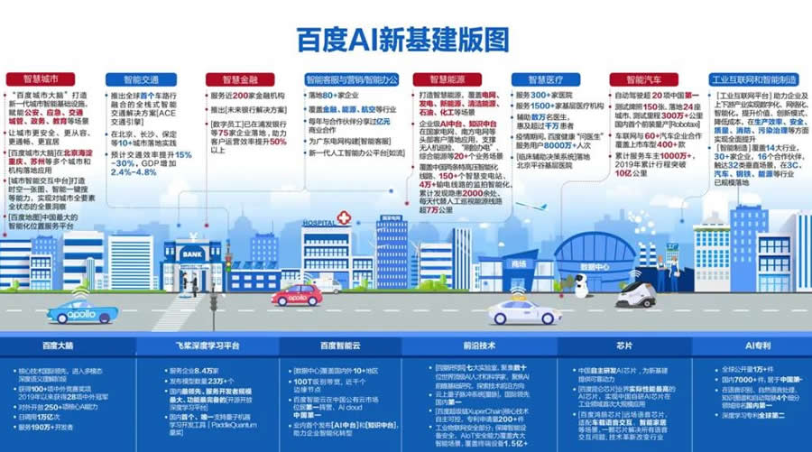 6月11日,百度發(fā)布AI新基建版圖,目標(biāo)成為中國新基建AI服務(wù)大提供商。依托百度大腦、飛槳深度學(xué)習(xí)平臺、百度智能云、芯片、量脈、超級鏈等在內(nèi)的新型AI基礎(chǔ)設(shè)施,百度在智慧城市、智能交通、智慧金融、智能客服與營銷、智慧能源、智慧醫(yī)療、智能汽車、工業(yè)互聯(lián)網(wǎng)和智能制造等八大L域推動產(chǎn)業(yè)智能化升級。