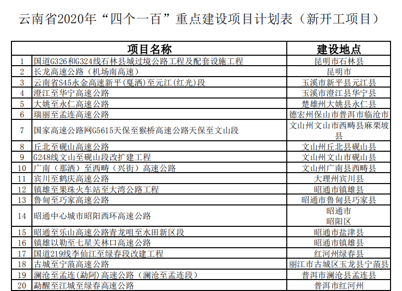 云南省2020年“四個一百”重點建設項目計劃表(新開工項目)