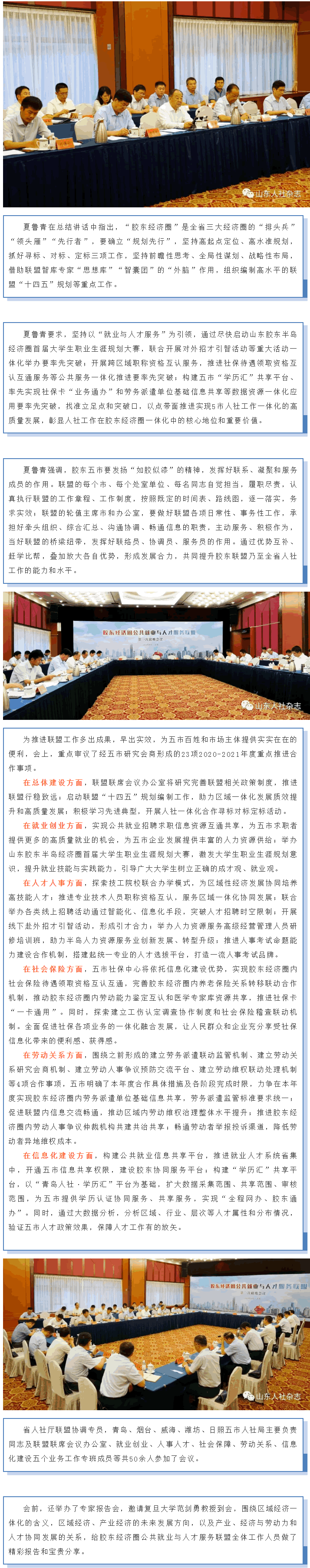 青島市人民政府秘書長孫繼出席會議并致辭。聯盟聯席會議主席,省人力資源社會保障廳黨組副書記、副廳長、一級巡視員夏魯青作總結講話。聯盟D一任輪值執行主席、秘書長,青島市委組織部副部長、市人力資源和社會保障局黨組書記、局長胡義瑛主持會議。