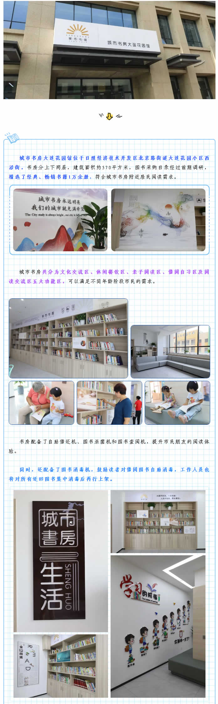 城市書房大連花園館位于日照經濟技術開發區北京路街道大連花園小區西沿街,書房分上下兩層,建筑面積約570平方米,圖書采購目錄經過前期調研,精選了經典、暢銷書籍1萬余冊,符合城市書房附近居民閱讀需求。
