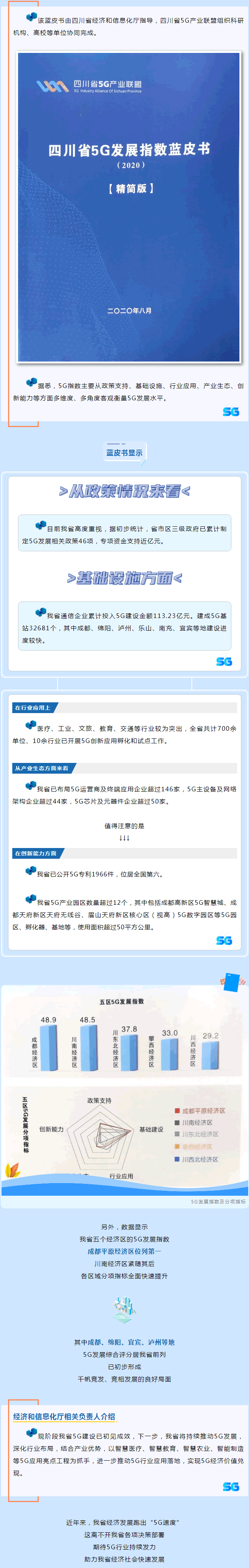 四川省5G產(chǎn)業(yè)聯(lián)盟牽頭編制的《四川省5G發(fā)展指數(shù)藍(lán)皮書(2020版)》(下簡稱:5G發(fā)展指數(shù))首次發(fā)布。此次發(fā)布的藍(lán)皮書由省經(jīng)濟(jì)和信息化廳指導(dǎo),四川省5G產(chǎn)業(yè)聯(lián)盟組織科研機(jī)構(gòu)、G校等單位協(xié)同完成。該藍(lán)皮書顯示,四川5G建設(shè)已初見成效:通信企業(yè)累計(jì)投入5G建設(shè)金額113.23億元;在創(chuàng)新能力方面,已公開5G專利1966件,位居全國第六,5G產(chǎn)業(yè)園區(qū)數(shù)量超過12個(gè);在產(chǎn)業(yè)生態(tài)方面,已布局5G運(yùn)營商及終端應(yīng)用企業(yè)超146家,5G主設(shè)備及網(wǎng)絡(luò)架構(gòu)企業(yè)超44家,5G芯片及元器件企業(yè)超50家。