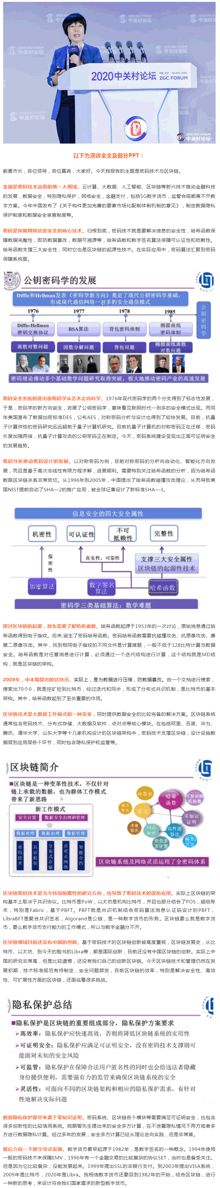 在2020中關(guān)村論壇上,中國科學(xué)院院士,國際密碼協(xié)會會士(IACRFellow),清華大學(xué)G等研究院“楊振寧講座”教授王小云發(fā)表《密碼技術(shù)與區(qū)塊鏈》主題演講。