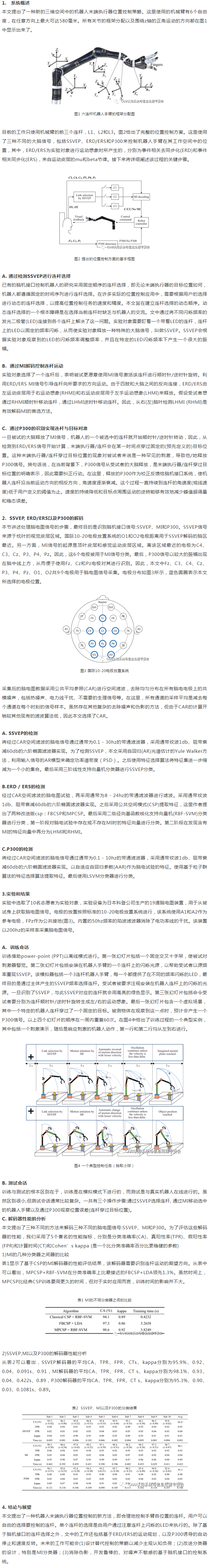 近年來,腦機接口在輔助機器人和康復(fù)工程方面的應(yīng)用日益廣泛,現(xiàn)有的為位置控制應(yīng)用程序設(shè)計的腦機接口存在兩個基本限制。首先,現(xiàn)有的方案大多采用開環(huán)控制,因此無法跟蹤位置誤差,導(dǎo)致無法采取必要的在線糾正措施。有一些基于腦電圖(EEG)的位置控制的工作雖然采取了閉環(huán)控制,但現(xiàn)這些腦誘導(dǎo)閉環(huán)位置控制方案采用的是固定順序的連桿選擇規(guī)則,這往往造成瓶頸,阻礙了有效的控制。其次,現(xiàn)有的腦誘導(dǎo)位置控制器被設(shè)計成像傳統(tǒng)的一階系統(tǒng)一樣產(chǎn)生位置響應(yīng),導(dǎo)致較大的穩(wěn)態(tài)誤差。文中通過穩(wěn)態(tài)視覺誘發(fā)電位(SSVEP)實現(xiàn)任意的選擇連桿以達到有效控制,并生成位置控制系統(tǒng)的二階響應(yīng),逐步減少過射/欠射,以減少穩(wěn)態(tài)誤差,從而克服了上述兩個限制。文中還提出了利用運動想象(MI)和P300信號來設(shè)計混合腦機接口系統(tǒng),通過在位置誤差的零交叉處使用速度反轉(zhuǎn)來逐漸減少誤差裕度。