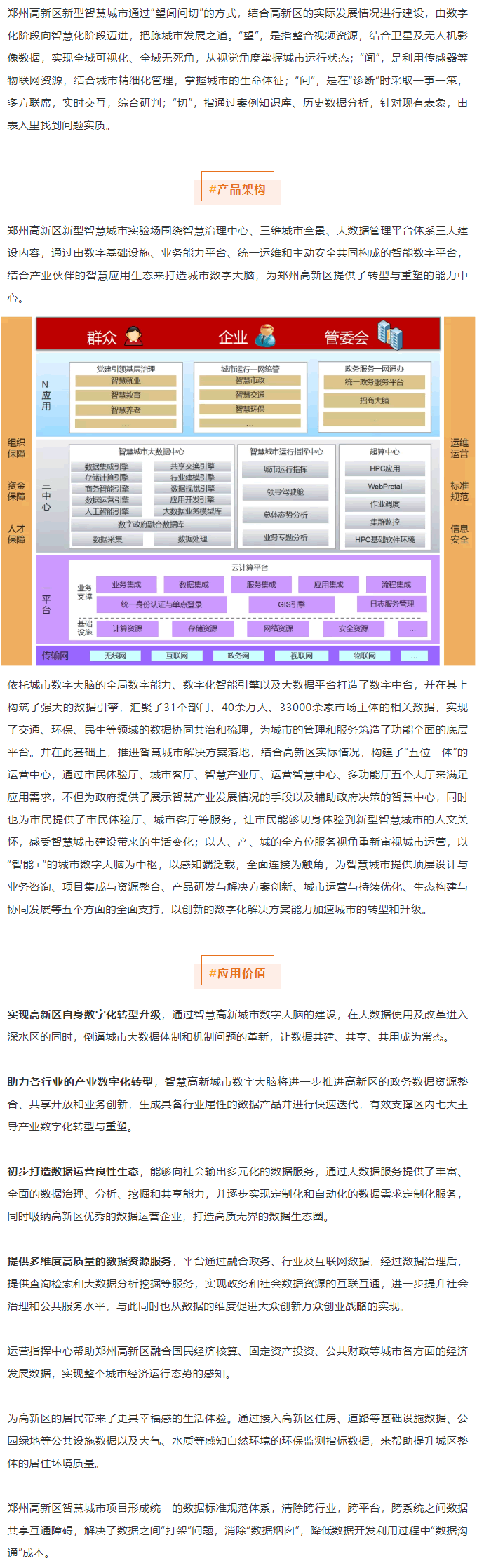 鄭州G新區新型智慧城市實驗場圍繞智慧治理中心、三維城市全景、大數據管理平臺體系三大建設內容,通過由數字基礎設施、業務能力平臺、統一運維和主動安全共同構成的智能數字平臺,結合產業伙伴的智慧應用生態來打造城市數字大腦,為鄭州G新區提供了轉型與重塑的能力中心。