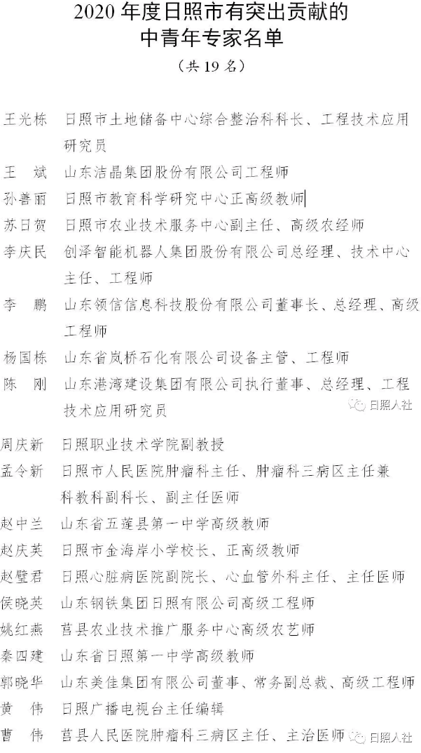 市政府公布了2020年度日照市有突出貢獻的中青年專家名單,授予王光棟等19名同志“日照市有突出貢獻的中青年專家”稱號。截至目前,全市已有137名專家獲得該稱號。