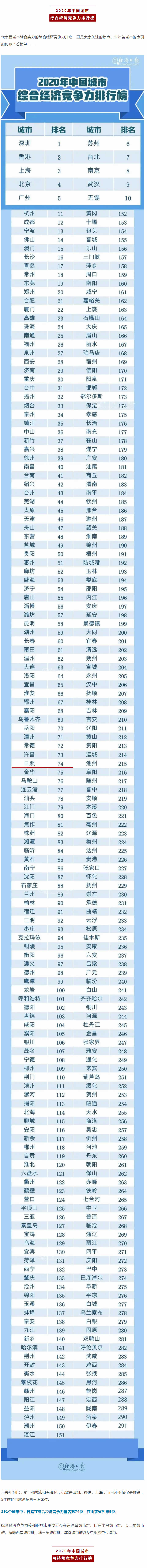 報告顯示,2020年城市綜合經濟競爭力指數10強依次是:深圳、香港、上海、北京、廣州、蘇州、臺北、南京、武漢和無錫。2020年中國可持續競爭力指數10強依次是:香港、深圳、臺北、上海、北京、廣州、蘇州、南京、青島和武漢。