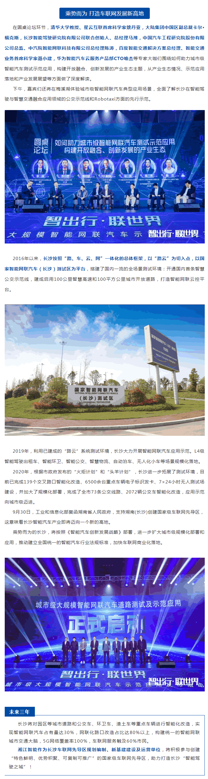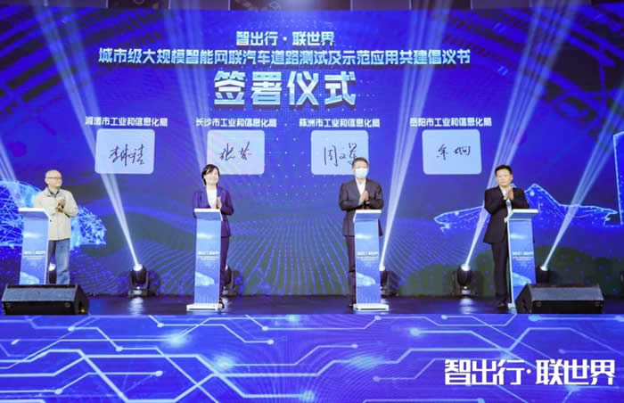 長沙市、株洲市、湘潭市、岳陽市工業(yè)和信息化局共同簽署了《城市級大規(guī)模智能網聯(lián)汽車道路測試及示范應用共建倡議書》。